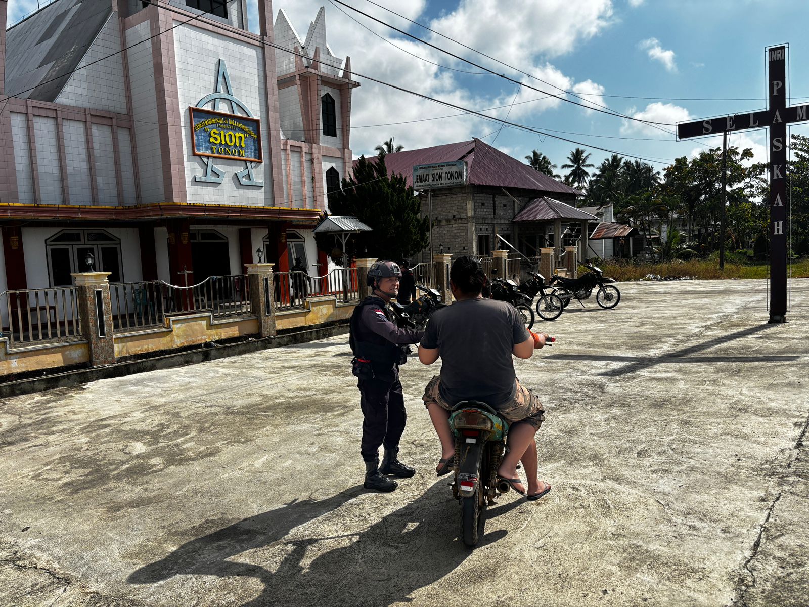 Bolmong- Untuk memberikan rasa nyaman saat Ibadah Jumat Agung wafat Isa Almasih Batalyon B Pelopor Sat Brimob Sulut gelar Patroli Cipta Kondisi untuk ke gereja-gereja yang berada di wilayah Dumoga Raya, Kabupaten Bolaang Mongondow, Sulawesi Utara.Jumat (03/04/2026) pagi.