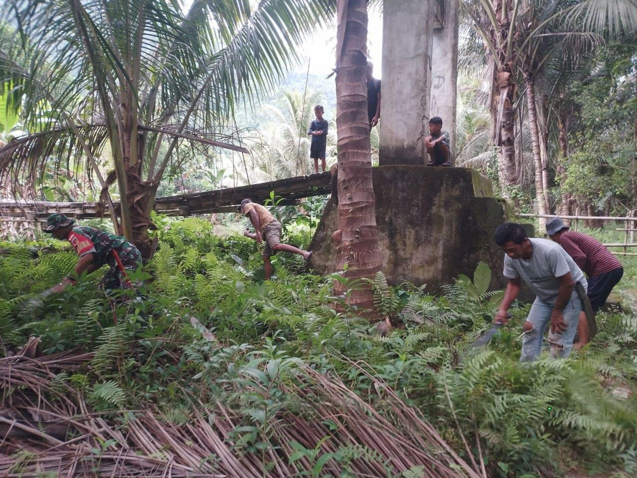 Semangat kebersamaan di suasana pagi yang tenang di Desa Matabulu Kecamatan Nuangan Kabupaten Bolaang Mongondow Timur, Di bawah rindangnya pohon kelapa anggota Babinsa Koramil 1303-05/ Kotabunan bersama warga setempat membersihkan semak dan rumput liar yang mulai menutupi akses jembatan yang menghubungkan antar dusun di desa tersebut. Rabu (01/04/2026)